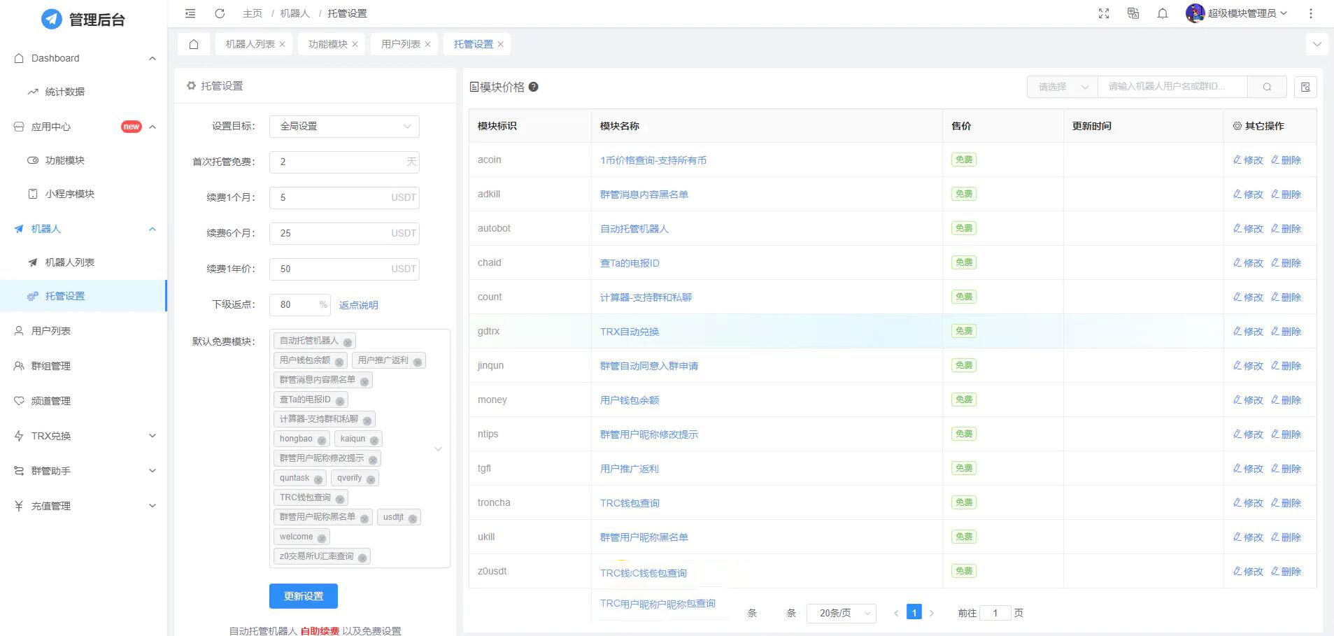 trx兑换 闪兑 关键字监控 群管 usdt监控 余额查询 推广分享 等几乎常见的TG机器人功能都有
