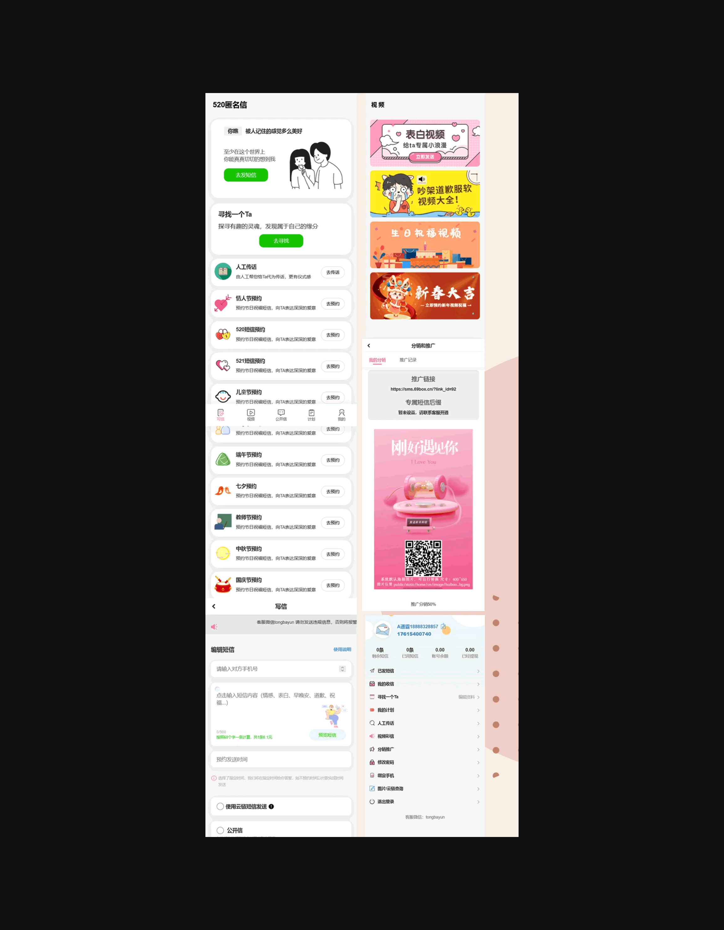精灵传信支持在线提交发送短信,查看回复短信,在线购买额度,自定义对接易支付,设置违禁词,支持网站+小程序双端。
