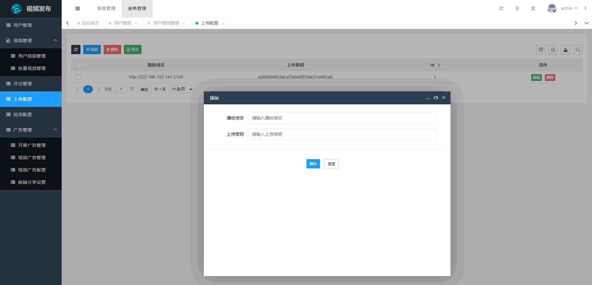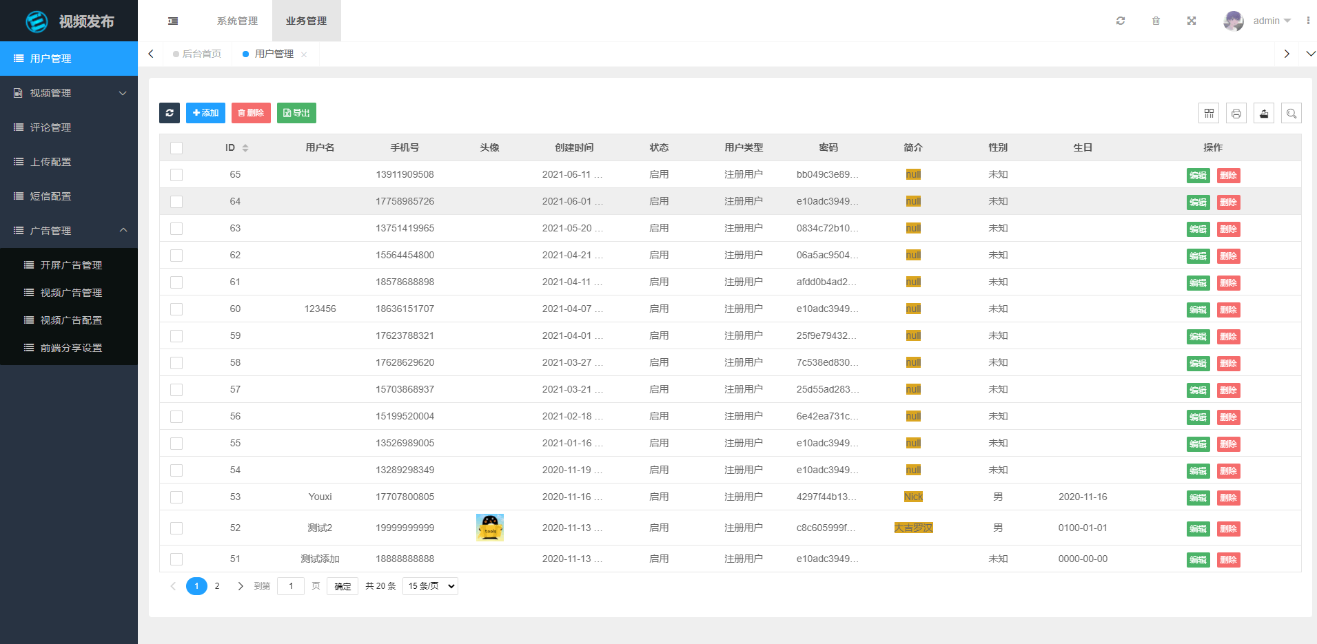 程序是一个简单的视频系统,依靠广告进行收益 1,用户关注内只能刷到用户所关注的用户发的视频平均*条一个广告 2,热门推荐随机推荐每次打开不同内容 3,广场的话以抖音同城那样显示,点击才会进入播放, 4,我的 是用户中心,可查看自己发布,自己点赞,自己关注谁,可编辑头像昵称,修改账户密码 5,客户发布视频后台可以进行审核,需要审核通过才会发布出去 6,我们自己发布,前台也要显示用户发布的,我们需要很多用户,后端分开官方与用户发布视频 7,评论区的话,后台能查看评论区,并可以删除评论 8,点赞评论关注分享均需注册用户才可以使用,不注册只能在热门与广场看视频,后台可以管理注册用户,(修改密码,暂停或者启用账户)注册以手机注册 9,开屏启动5秒广告 可配置多个 前端根据顺序进行每次打开不同轮播 视频上传使用的第三方 PPVOD 云转码视频管理系统,此系统是付费系统,购买前切记 注册短信使用的第三方 短信宝 短信系统,此系统是付费系统,购买前切记